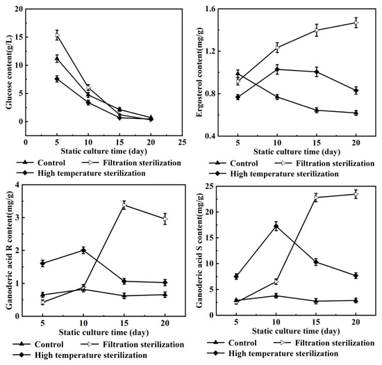 The consumption of glucose, the synthesis of the by-product ergosterol and the target product (ganoderic acids R, S and T) in the two-stage fermentation culture of G. lucidum were analyzed during the fermentation process. As shown in Figure 1, the consumption of glucose under the conditions of adding high-temperature-sterilized oleic acid and filter-sterilized oleic acid were consistent with that of the control group, and the glucose was basically consumed on the 20th day of static culture. However, the synthesis of ergosterol was quite different. Under the condition of adding high-temperature-sterilized oleic acid, the synthesis of ergosterol increased in advance and then decreased, with a maximum value of 1.03 mg/g on the 10th day of static culture. The content of ergosterol was positively correlated with the culture time under the condition of adding filter-sterilized oleic acid, and reached the maximum value of 1.47 mg/g on the 20th day of culture. The ergosterol content in the control group was the highest on the 5th day of static culture, which was 0.99 mg/g. Compared with the control group, the content of ganoderic acids R, S and T was quite different. Under the condition of adding high-temperature-sterilized oleic acid, the ganoderic acids R, S and T reached the maximum of 2.00 mg/g, 17.26 mg/g and 9.33 mg/g on the 10th day of static culture, which were 1.44 times, 3.55 times and 0.38 times higher than the control of 0.82 mg/g (the 10th day of static culture), 3.79 mg/g (the 10th day of static culture) and 6.77 mg/g (the 20th day of static culture), respectively. The highest results of the ganoderic acids R, S and T in the filter-sterilized oleic acid group were 3.38 mg/g (15 days), 23.46 mg/g (20 days) and 16.49 mg/g (20 days), respectively, which were 3.11 times, 5.19 times and 1.44 times higher, respectively, than those of the control group.