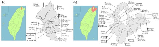 Geographic distribution of pet rabbits recruited from Northern Taiwan. The prevalence of dermatophyte infection in rabbits is higher in (b) New Taipei City (13.3%, 18/135) than that in (a) Taipei City (9.56%, 11/115), p value = 0.4297.