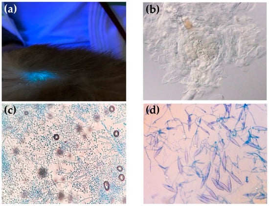 Dermatophyte detection methods used in this study: (a) fluorescent reaction on the rabbit body examined by Wood’s lamp; (b) presence of fungal spore with a 10% KOH preparation; (c) microscopic characteristics of Trichophyton spp.; (d) microscopic characteristics of Microsporum spp.