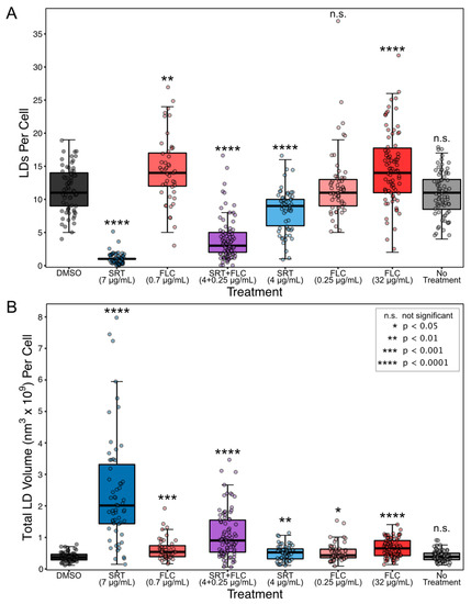 The different drug treatments exert distinct effects on C. neoformans LDs after 12 h. (A) Effect of SRT on the number of LDs per cell. Significant differences in the number of LDs per cell between DMSO and the other treatments were evaluated using pairwise Welch’s t-tests. Reported p-values were adjusted using Holms’ correction to account for multiple comparisons. (B) Effect of SRT on the total volume of cellular LDs in C. neoformans. Significant differences in the LD volume per cell between DMSO and the other treatments were evaluated using pairwise Welch’s t-tests as in (A).