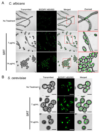 SRT treatment induces SLDs in C. albicans and S. cerevisiae. (A) Treatment with SRT induces the formation of enlarged LDs and reduces hyphal growth in C. albicans. SC5314 cells were grown for 12 h in YPD at 30 °C with 150 RPM shaking, then resuspended to a density of 5.0 × 106 cells/mL in fresh RPMI-1640 containing the drug. Treated cultures were incubated for 12 h at 37 °C with 150 RPM shaking. Cells were then harvested by centrifugation, fixed with 4% paraformaldehyde, stained with 5 μM BODIPY 493/503, loaded onto a poly-d-lysine-coated coverslip, and imaged. Images shown are projected from Z-stacks; transmitted images were Z-projected by minimum intensity, while fluorescence images are Z-projected by maximum intensity. Scale bars = 5 μm. (B) Treatment with SRT induces the formation of enlarged LDs in S. cerevisiae. S288c cells were grown for 12 h in RPMI-1640 at 30 °C with 150 RPM shaking, then resuspended to a density of 5.0 × 106 cells/mL in fresh RPMI-1640 containing the drug. Cultures were incubated for an additional 12 h at 30 °C with 150 RPM shaking. Cells were then harvested by centrifugation, fixed with 4% paraformaldehyde, stained with 5 μM BODIPY 493/503, loaded onto a poly-d-lysine-coated coverslip, and imaged. Images shown are projected from Z-stacks; transmitted images were Z-projected by minimum intensity, while fluorescence images are Z-projected by maximum intensity. Scale bars = 5 μm.