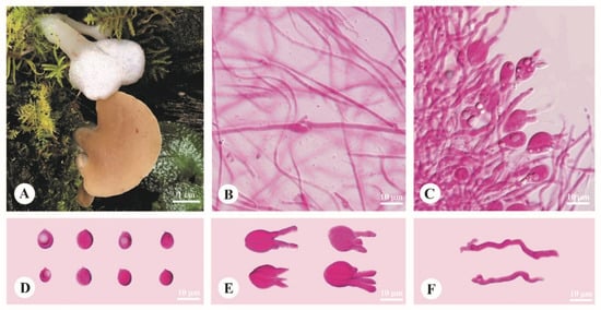 The studied specimens are deposited in the herbaria of the Institute of Microbiology, Beijing Forestry University (BJFC) and Landcare Research (PDD), New Zealand. Morphological descriptions are based on field notes and voucher specimens. Color terms are from Anonymous [34], Petersen [35], and Kornerup and Wanscher [36]. Microscopic structures refer to Pippola and Kotiranta [37], Malysheva et al. [38], and Fan et al. [39]. Handmade sections of voucher basidiomata were examined using a Nikon Eclipse 80i microscope (magnification ×1000) after being mounted in 5% KOH for five minutes and treated with 1% Phloxine B (C20H4Br4Cl2K2O5). Microscopic structures were photographed using a Nikon Digital Sight DS-L3 or Leica ICC50 HD camera. At least 20 basidia and basidiospores from each specimen were measured. Spore measurements are quoted as means and standard deviations (±1.5 σ) or with 5% of measurements excluded from each end of the range given in parentheses. Stalks were excluded for basidia measurements, and the hilar appendages were excluded for basidiospore measurements. The following abbreviations are used in the descriptions: IKI = Melzer’s reagent, IKI– = neither amyloid nor dextrinoid, CB = Cotton Blue, CB– = acyanophilous in Cotton Blue, L = arithmetic average of all spore lengths, W = arithmetic average of all spore widths, Q = L/W ratios, n (a/b) = number of spores (a) measured from a given number (b) of specimens, and σ = standard deviation from the mean.