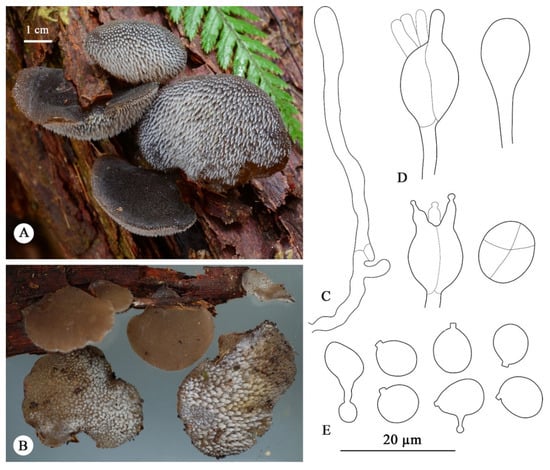 Basidiomata and microscopic structures of Pseudohydnum orbiculare. (A) Basidiomata (holotype PDD 112653). (B) Basidiomata (PDD 112654). (C) A hyphidium. (D) Basidia. (E) Basidiospores.