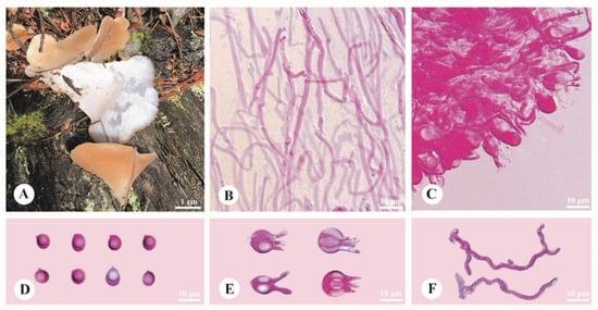 Basidiomata and microscopic structures of Pseudohydnum tasmanicum (holotype, Cui 16721). (A) Basidiomata. (B) Tramal hyphae. (C) A section of hymenium. (D) Basidiospores. (E) Basidia. (F) Hyphidia.