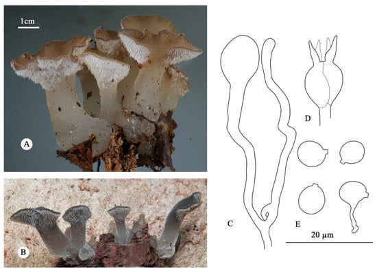 Basidiomata and microscopic structures of Pseudohydnum totarae. (A) Basidiomata (PDD 112655). (B) Basidiomata (PDD 106891). (C) A probasidium and a hyphidium. (D) A basidum. (E) Basidiospores.