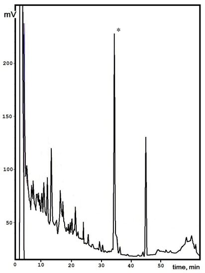 According to previous data, a high level of active compounds from culture liquids was obtained for the S. alkalinus 8KS17-10 strain. Analytical separation by reversed-phase HPLC for the ethyl acetate extract was carried out according to the data described earlier []. The maximum amount of an individual peak was determined for the 8KS17-10 strain, and it was selected for further investigations. It was shown that an active compound can be attributed to the group of peptides based on the totality of the identified structural features (molecular weight, absorption ratio at certain wavelengths). Previously, a component with a retention time of 31.171 min with strong antifungal activity against a number of clinical fungal and yeast isolates (Candida spp., Aspergillus spp., and Cryptococcus neoformans) was shown [].