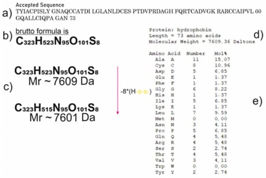 Physicochemical properties of the hydrophobin. (a) The sequence of the hydrophobin, annotated under the result of the full-genome sequencing of the ex-type strain of Sodiomyces alkalinus, F11. (b) Atom composition of the goal protein, impressed in numbers of corresponding atoms. (c) Chemical transition in mass and atom composition due to all of the disulfide bonds forming. (d) Information about the exact mass of the protein. (e) The amino acid composition of the hydrophobin.