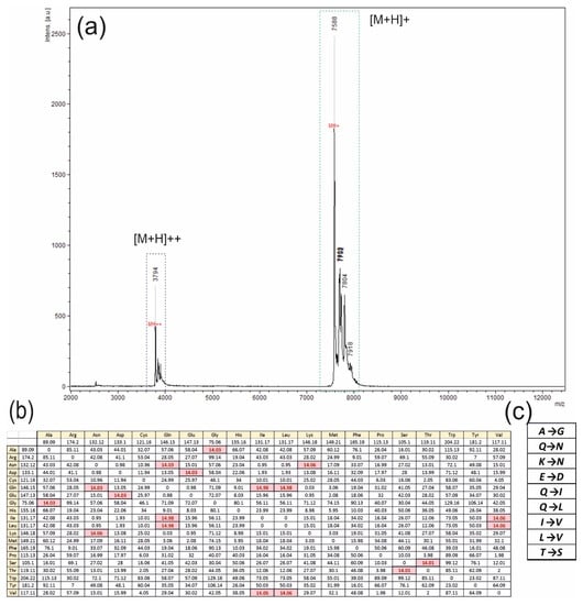 Analysis of peaks with the MALDI-TOF MS method. (a) The spectrum with two fields of peaks is presented. The main peak, with a mass of 7588 Da, is highlighted with others in one set in the dotted rectangle colored in green, and another set of peaks with the main peak mass of 3794 Da is highlighted with the blue dotted rectangle. Symbols [M+H]+ and [M+H]++ mean the masses of the molecular ions plus proton, the single-charged and double-charged ions, respectively. (b) The table, including information about the molecular mass differences between each of the natural amino acids; results are presented in Da units, and the goal of 14 Da, meaning between corresponding amino acids, is colored in red. (c) The set of possible amino acid single changes in the hydrophobin, calculated over the molecular masses, is presented.