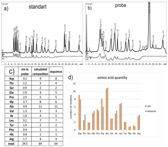 The results of the amino acids’ analysis. (a) Chromatogram of the standard mixture of amino acids examined at two wavelengths: 440 nm (ch1) and 590 nm (ch2). (b) Chromatogram of the real amino acid mixture, obtained via the hydrolysis of the hydrophobin with mineral acids (ch1 and ch2 are the same as those in (a)). (c) A table with the amino acids’ quantification and transformation into numbers of amino acids in a hypothetical protein in a sample (calculated composition), and the amino acid numbers in a query annotated sequence (sequence). Some of the amino acids are not presented in the table (Lys, Met, Trp, and Cys) due to their degradation; still, the mineral acid hydrolysis take place, and the others (Gln and Asn), at the same conditions, transform into Glu and Asp, correspondingly. (d) Information about the amino acid distribution in the protein examined via amino acid analysis (orange bars) and the residue numbers in the annotated sequence (grey) is graphically presented.