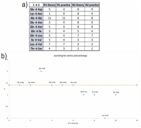 Amino acid change research over the amino acid analysis results. (a) A table including all of the possible amino acid changes, where the initial amino acid, “1” (presented in the annotated sequence), changed to another one, “2” (presented in the results of research). N1 and N2 are the numbers of corresponding amino acids. (b) The d function plot is depicted. Each amino acid change is displayed on the plot with the calculated meaning of the d function. The d function value, related to the normal proportion of a one-letter change in the protein, is marked on the plot as a yellow dotted straight line.