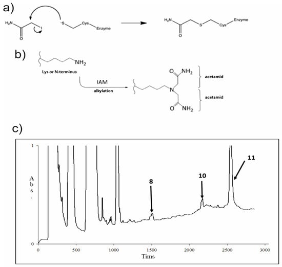 Protein modification and trypsinolisys results. (a) The chemical reaction of cysteine modification with IAA is presented. (b) The adverse reactions of the lysine side chain amino group and the N-terminus of the polypeptide modification with IAA are depicted. (c) An RP-HPLC chromatogram of the sample, performed after the trypsinolisys took place. The collected peaks are marked with corresponding numbers.