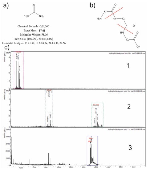 MALDI-TOF MS analysis of the collected fractions. (a) An acetamide radical as a modifying unit is presented with some physicochemical information. (b) The character of probable fragmentation in the MS|MS specters and the broken bonds are marked with red lines. (c) The mass specters of chromatographically collected fractions are presented. Peaks within every set that differ between each other by 57 Da (modifying unit) are marked with black lines and indexes “+57” above the peaks. For specters 1 and 2, the peak sets were highlighted in dotted rectangles colored in corresponding colors. The set in specter 3 is highlighted in a continuous rectangle as the mass of the unmodified hydrophobin.
