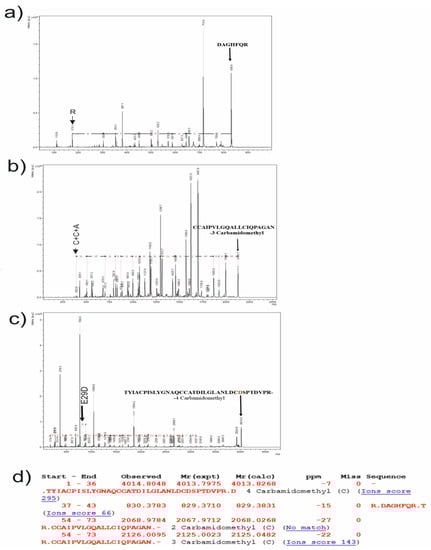 Every specter of the MS|MS analysis of the corresponding masses, 829, 2125, and 4013 Da, was sequenced, using tools of Bruker Daltonics flexAnalysis 3.4 software (Bruker, Billerica, MA, USA). The first two masses were aligned to the corresponding fragment (marked on the MS|MS specters) of the annotated sequence, but the mass of 4013 also seems to be the fragment with one amino acid change in the 29 position (Figure 8c).