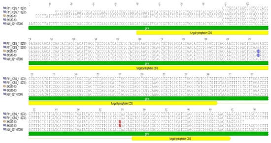 Alignment of hydrophobin DNA sequences. The alignment shows single-nucleotide polymorphisms (SNPs) in the S. alkalinus 8KS17-10 strain. An exon substitution is marked by blue highlighting, and an intron SNP by red highlighting.