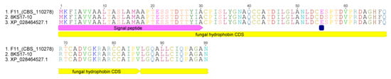 To confirm the sequence of the hydrophobin and to examine the conservation of this protein, a sample of the hydrophobin isolate obtained by EtOAc, produced by the S. alkalinus 8KS17-10 strain and subsequent chromatographic purification, was analyzed.