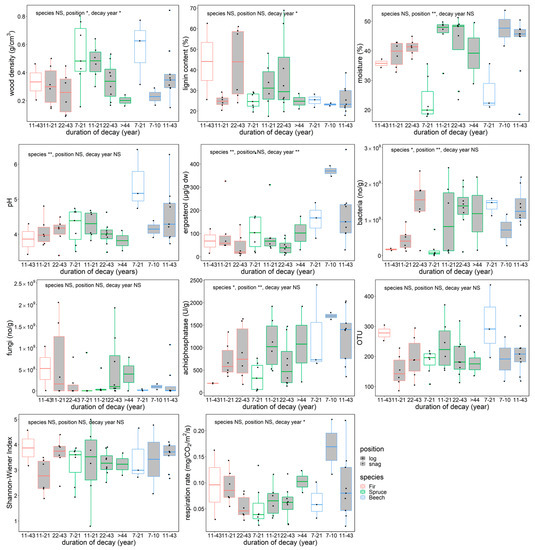 Dead wood density decreased with decay length, and snag wood density was higher than log density for all species (Figure 2). Lignin content increased with decay length (p < 0.05), reaching more than 60% of relative content in coniferous snags and logs that had been decaying for 22–43 years. Moisture content of dead wood was significantly lower in snags for all species (p < 0.01). Fir and spruce showed significantly lower pH than beech (p < 0.01). Ergosterol content decreased as decay length increased (species, p < 0.01; decay length, p < 0.01), and beech had the highest content of the three tree species. Copy numbers of bacteria were significantly different among species (p < 0.05) and positions (p < 0.01), whereas fungal copy numbers showed no significant differences in the dead wood categories. Acid phosphatase activity differed among species (p < 0.05), and snags had lower activities than logs (p < 0.01). The dead wood categories were not significantly different in terms of fungal OTU richness or Shannon–Wiener diversity index. The respiration rate of dead wood significantly decreased as decay length increased (p < 0.05).