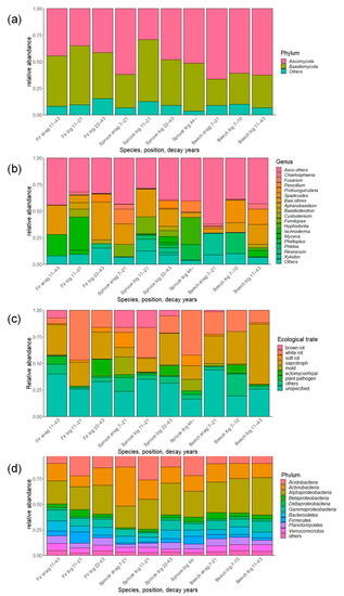 Composition of fungal and bacterial communities associated with dead wood in the Zofin Forest on the level of (a) fungal phylum, (b) genus, (c) ecological trait, and (d) bacterial phylum/class.