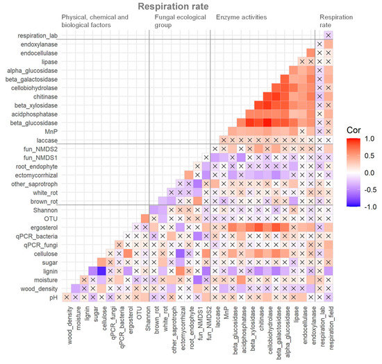 Correlation matrix of measured variables of physico–chemical and biological factors, relative abundance of fungal ecological groups, enzyme activities, and respiration rate of dead wood in the Zofin Forest. The cross marks indicate the absence of significant correlation (p < 0.05).