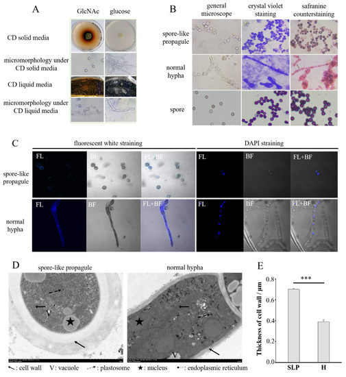 - Hu, P.; Ding, H.; Shen, L.; He, G.-J.; Liu, H.; Tian, X.; Tao, C.; Bai, X.; Liang, J.; Jin, C.; et al. A unique cell wall synthetic response evoked by glucosamine determines pathogenicity-associated fungal cellular differentiation. PLoS Genet. 2021, 17, e1009817. [Google Scholar] [CrossRef] [PubMed]