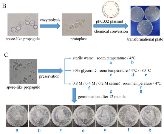2.6. The Phenotypes and Genetic Transformation Assay of the Spore-like Propagule