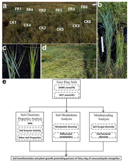 Apparent morphology of fairy rings and technical route of the study methods. (a) Fairy ring landscape and soil sampling point in this study, FR1-6 mean sampling point in DARK zone; CK 1-6 sampling point in OUT zone. (b) Comparison of plant height between DARK (upper) and OUT (lower) zones. (c) Comparison of leaf color between DARK (left) and OUT (right) zone; (d) Lush vegetation inside the DARK zone. (e) The technical route of this study.