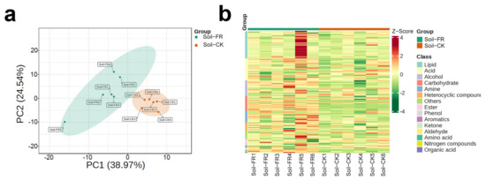 Distribution of soil metabolites in the FR and CK zones of the fairy ring ecosystem. (a) Principal component analysis (PCA) score plots of soil metabolome. PC1 represents the first principal component, and PC2 represents the second principal component. Percentage values indicate the proportion of variance explained. (b) Heat map clustering of the soil metabolites. Sample names are presented along the horizontal axis, and metabolite classes are written vertically; different colors on the map indicate the relative content of the metabolite (red represents high content, green represents low content).