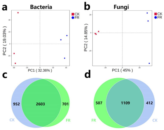 PCA and Venn analysis of bacteria and fungi in the FR and CK zones of the fairy ring ecosystem. (a,b) PCA of the bacterial and fungal OTUs in the FR and CK soils. The colored dots in the figures represent the different sample groups. (c,d) Venn analysis of the bacterial and fungal OTUs.