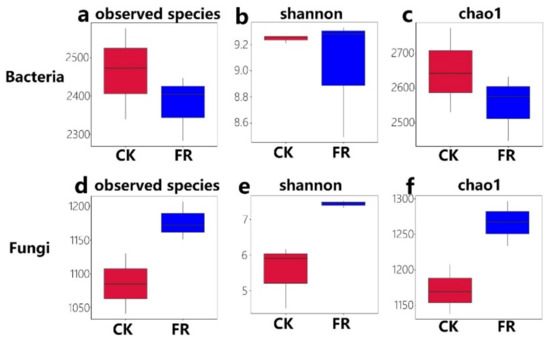 Alpha diversity of bacteria and fungi in the FR and CK zones of the fairy ring ecosystem. Boxes show: the top whisker represents the maximum value, the bottom whisker represents the minimum value, the line inside the box represents the median, the top margin of the box represents the upper quartile, and the lower margin of the box represents the lower quartile. (a,d) observed species indices of bacteria and fungi; (b,e) shannon indices of bacteria and fungi; (c,f) chao1 indices of bacteria and fungi.