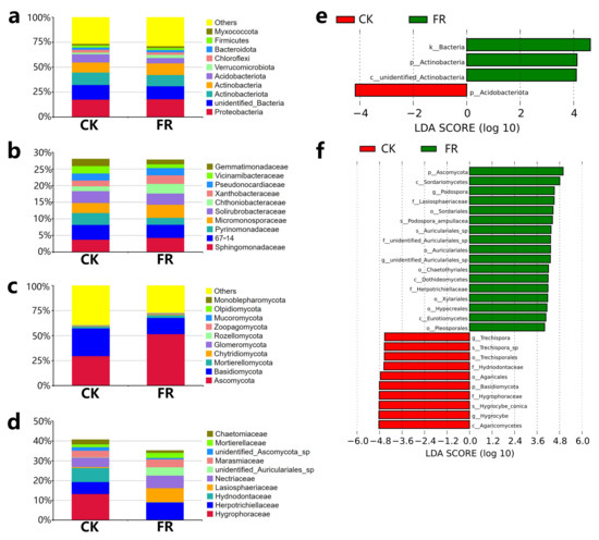 Microbial community composition and LEfSe analysis of bacteria and fungi in the FR and CK zones of the fairy ring ecosystem. The relative abundance of the bacteria community at the (a) phylum level and (b) family level. The relative abundance of the fungal community at the (c) phylum level and (d) family level. LEfSe analysis of (e) bacteria and (f) fungi.