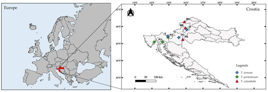 Map of the Tricholoma spp. mushroom sample collection sites across Croatia.