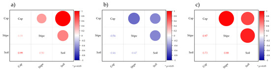 Correlation between Cd contents in the soil, cap, and stipe parts of Tricholoma spp. ((a) T. columbetta, (b) T. portentosum, and (c) T. terreum); * indicates level of significance (p < 0.05); refer to the color scale bar for interpretation of correlation coefficient values as text and circles.