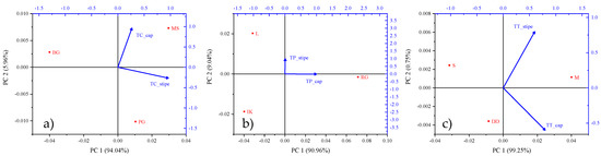 PCA biplot showing interactions between sampling locations and Cd contents in the cap and stipe parts of Tricholoma spp. ((a) T. columbetta, (b) T. portentosum, and (c) T. terreum).