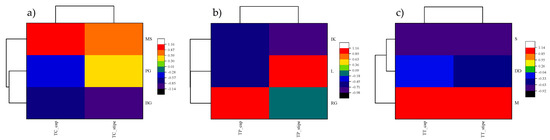 Clustered heatmap showing similarities between sampling locations and Cd contents in the cap and stipe of Tricholoma spp. ((a) and TC: T. columbetta, (b) and TP: T. portentosum, (c) and TT: T. terreum).