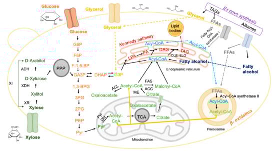 Enzymes involved in the lipid biosynthetic pathway are likely key molecular targets for the development of strategies to improve yeast oil accumulation. One of the most widely used approaches relies on the increase in the expression of genes encoding enzymes that directly influence oil accumulation (Table 6). Two of the most explored molecular targets are the diacylglycerol O-acyl-transferases (DGA) encoding genes. The enzyme Dga1 was characterised in different yeast species and its overexpression promotes lipid accumulation [,,,,,]. In Y. lipolytica, two different coding genes, DGA1 and DGA2, were identified, but YlDGA1 outperforms YlDGA2 []. Another approach involves the redirection of the central carbon metabolism to increase the availability of precursors by the over-expressing malic enzyme (ME) and acetyl-CoA carboxylase (ACC) that supply the pathway with the essential molecules, acetyl-CoA, NADPH, and malonyl-CoA, respectively (Table 6). Since the malic enzyme of R. toruloides is the main enzyme providing NADPH during synthesis, its expression is essential for lipid accumulation [], whereas its overexpression in Y. lipolytica or L. starkeyi does not alter lipid accumulation [,]. In Y. lipolytica, the main source of NADPH is the pentose phosphate pathway []. To surpass this limitation, four biosynthetic pathways were designed to convert NADH into NADPH in Y. lipolytica. The best result was obtained for a Y. lipolytica strain co-overexpressing the glyceraldehyde-3-phosphate dehydrogenase GapC (catalyses the conversion of glyceraldehyde 3-phosphate to 1,3-diphosphoglycerate with the reduction of NAD to NADH) and malate dehydrogenase, the enzyme encoded by the Mucor circinelloides MCE2 gene; this enzyme is responsible for the decarboxylation of malate with reduction of NADP+ to NADPH (Table 6) []. The overexpression in Y. lipolytica and R. toruloides of acetyl-CoA carboxylase, encoded by ACC1 which catalyses the carboxylation of acetyl-CoA to malonyl-CoA, led to an increased lipid content [,]. On the other hand, the homologous or heterologous overexpression of ATP-citrate lyase (ACL) genes, responsible for the supply of acetyl-CoA from the cleavage of citrate, did not lead to an increase in lipid content []. Other genetic manipulations were also explored, including the manipulation of fatty acid synthesis to obtain lipids with longer chains or targeting the expression of acyl-CoA/acyl-ACP processing enzymes in other cellular compartments, such as the cytoplasm, the peroxisome or the endoplasmic reticulum, in order to minimise the effects of compartmentalisation on the accessibility to the downstream engineered biocatalysts [].