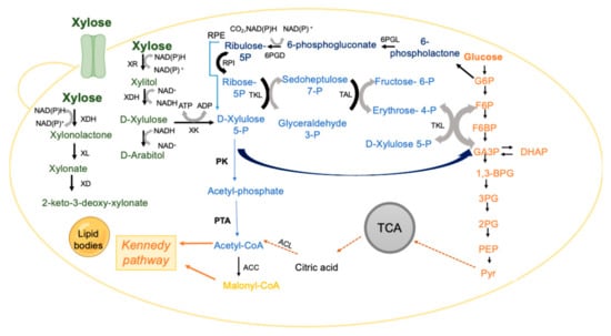 Due to the limited genetic tools for both Rhodosporidium sp./Rhodotorula sp. and Lipomyces sp., genetic and metabolic engineering studies are scarce and have not yet allowed the detailed clarification of their xylose assimilation pathway. Y. lipolytica is known to possess in its genome genes encoding xylose reductase, xylitol dehydrogenase and xylulose kinase, but they are not sufficiently expressed to allow the efficient utilisation of xylose []. Thus, several genetic engineering strategies were explored to improve xylose assimilation in this species (detailed in Section 7.3).