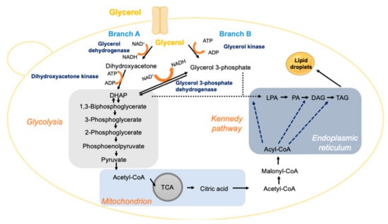 The use of glycerol as a carbon source by oleaginous species, as is the case for C. boidinii, C. curvatus, L. starkeyi, R. toruloides and Y. lipolytica [,,], occurs through the phosphorylation and oxidative pathways. For S. cerevisiae and Y. lipolytica, the active transport mechanism primarily uses glycerol/H+ antiporters []. Regarding the oxidative pathway (Branch A, Figure 4), the first step consists of the oxidation of glycerol to dihydroxyacetone through FAD/NAD dehydrogenase. Dihydroxyacetone is phosphorylated by a dihydroxyacetone kinase, producing dihydroxyacetone phosphate []. The other alternative reaction involves the enzyme 3-phosphoglycerate dehydrogenase (NAD-dependent), which catalyses the conversion of glycerol-3-phosphate into dihydroxyacetone phosphate in the mitochondria []. Once in the cytosol, dihydroxyacetone enters the glycolytic pathway (Branch B, Figure 4) and follows the TCA and Kennedy pathways (Figure 4). Considering the phosphorylation pathway, glycerol is phosphorylated by glycerol kinase, generating glycerol-3-phosphate that can enter directly into the Kennedy pathway for lipid production.