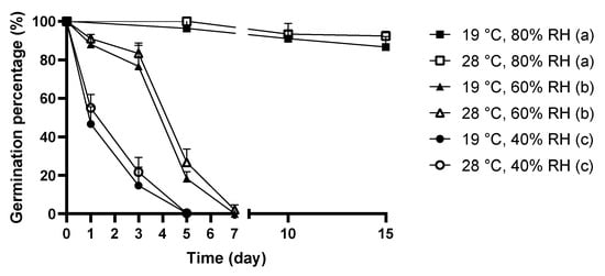 The germination percentage of the dehydrated mold spores was used as an indicator to assess mold viability. The viability of C. cladosporioides spores under moisture dynamics with different combinations of temperature and RH levels is presented in Figure 1.