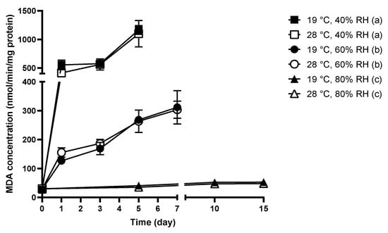 With respect to C. cladosporioides spores incubated at 80% RH, the lipid peroxidation level at both tested temperatures tended to be much lower than at 40% and 60% RH. A flattening change in MDA concentration (around 40 nmol/min/mg protein) was measured for both 19 °C and 28 °C, which was similar to the control wet condition (99% RH). Generally, the formation of MDA in C. cladosporioides spores was similar between 19 °C and 28 °C, when the RH was fixed, but a markedly higher MDA concentration was determined in C. cladosporioides spores exposed to lower RH levels.