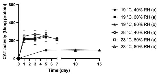 CAT is the key antioxidant enzyme produced to decompose H2O2 oxidative stress. As confirmed in our previous study, catalase (CAT) is the most significantly changed antioxidant enzyme in response to moisture dynamics []. Therefore, CAT activity was used to represent antioxidant responses in this study. The CAT activity of treated molds was quantified using a Catalase Assay Kit purchased from Cayman Chemical (Ann Arbor, MI, USA) following the protocol suggested by the manufacturer. Catalase activities of all samples were minimized with the protein concentration.
