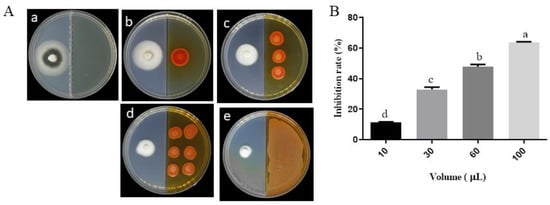 Effects of Pseudomonas aurantiaca ST-TJ4 VOCs on Verticillium dahliae colonies (A) and inhibition rate (B) after 10 days of cultures in 90 mm diameter I plates at 25 °C. Pictures in part A are referred to: (a) V. dahliae colony without ST-TJ4; (b–e) V. dahliae colony treated with 10, 30, 60, and 100 μL of the ST-TJ4 suspension (1 × 107 cfu mL−1). In section B, vertical bars represent the standard deviation of the average (n = 3). Different lowercase letters indicate significant differences (p < 0.05).