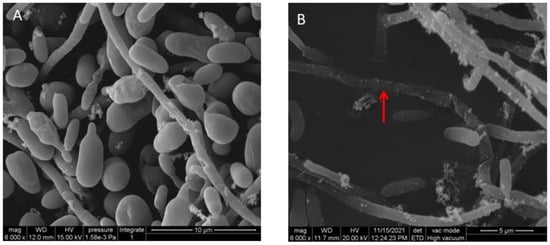 Observations at the scanning electron microscope of Verticillium dahliae hyphae in the control PDA plates (A) and after 4 days of exposure at volatile organic compounds emitted by Pseudomonas aurantiaca ST-TJ4 grown on King B agar medium (B). The red arrow indicates the hyphae shrink.