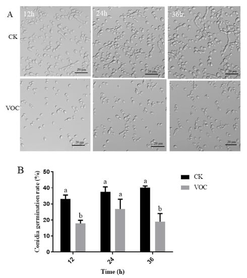 Verticillium dahliae conidia germination in overlapping plate assay after 12, 24, and 36 h exposure to liquid KB medium used as control ((A), CK) or 100 μL ST-TJ4 liquid cultures in KB medium ((A), VOC). Conidia germination rate (B). Conidia were considered germinated when the germ tube length exceeded half of the diameter. Vertical bars represent the standard deviation of the average (n = 3). Different lowercase letters indicate significant differences (p < 0.05).