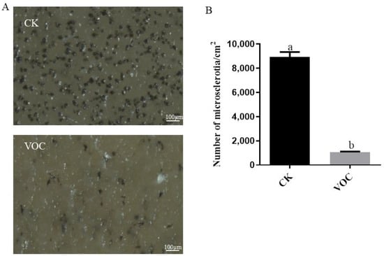The effect of VOCs of strain ST-TJ4 on Verticillium dahliae microsclerotia production: (A) Microscopic observation in control (CK) and VOCs treated plate (VOC); (B) numerical expression of counted microsclerotia. Vertical bars represent the standard deviation of the average (n = 3). Different lowercase letters indicate significant differences (p < 0.05).