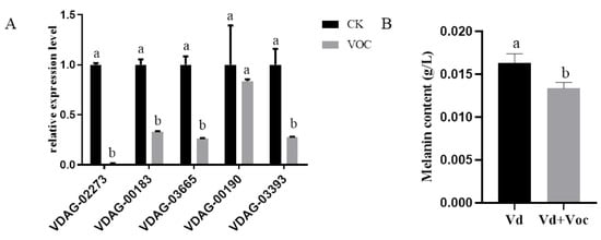 Effects exposure at volatileorganic compounds emitted by Pseudomonas aurantiaca ST-TJ4 on Verticillium dahliae melanin production: (A) gene expression corresponding to Hydrophobin (VDAG-02273), Anthocyanin reductase (VDAG-00183), 1,3,6,8-THN reductase (VDAG-03665), Polymerase (VDAG-00190), and Cylindrosporone dehydratase (VDAG-03393) using RT-qPCR. (B) V. dahliae melanin concentrations. Each histogram represents the average (n = 3). Vertical bars represent the standard deviation. CK = control, VOC = VOCs treated. For each CK/VOC combination, means capped with the same letter are not significant (p > 0.05).
