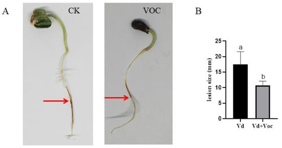 Aspect (A) and size (B) of lesions on roots of cotton variety “Miaobao 21” inoculated with Verticillium dahliae plugs (CK) and exposed to VOCs produced by Pseudomonas aurantiaca ST-TJ4. The red arrow indicates the lesion. Vertical bars represent the standard deviation of the average (n = 3). Different lowercase letters represent significant differences (p < 0.05).
