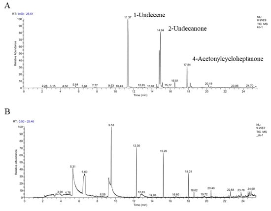 GC-MS analysis of volatile organic compounds produced by Pseudomonas aurantiaca ST-TJ4 incubated for 60 h in King B medium (A) or uninoculated medium (B). Erlenmeyer flasks were incubated in a shaker at 28 °C, 150 rpm.