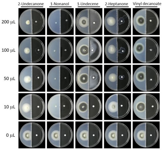 Among the 20 volatile compounds produced by the strain ST-TJ4 and assayed against V. dahliae, 2-undecanone and 1-nonanol have antifungal activity (Figure 8). In the range 10–200 μL, the effects of 2-undecanone are related to the increasing concentration evaluated. However, 1-nonanol has the complete inhibition at all the tested volumes.