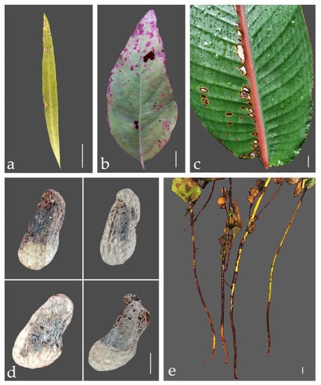 Field symptoms of diseased plants were collected from this study. (a) Leaf of Callistemon rigidus; (b) Leaf of Eucalyptus sp.; (c) Leaf of Strelitzia reginae; (d) Fruits of Arachis hypogaea; (e) Stems of Cassia surattensis; Scale bars: (a–e) = 1 cm.