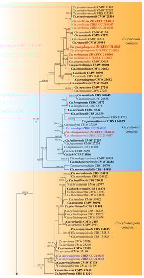 Notes—In the phylogenetic analysis, a single isolate was obtained from Eucalyptus gunnii clustered with Ca. hongkongensis with 99% ML and 1.00 BYPP support (Figure 2). The anamorph of the isolate from this study is similar to Ca. hongkongensis described by Crous et al. [] (Table 2). The telemorph was not observed in this study. To our knowledge, this is the first report of Ca. hongkongensis from E. gunnii [].