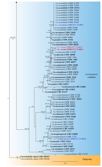 Notes—Two isolates obtained in this study developed a distinct sister clade to the Ca. ilicicola clade with 80% in ML and 0.98 in BYPP supports in phylogenetic analyses (Figure 2). Morphologically, the macroconidia of our isolates ( = 54 × 6 μm) are shorter than those of Ca. ilicicola ( = 62 × 6 μm) described by Lombard et al. [] (Table 2), and microconidia were not observed in this study. In the PHI analysis of closely related taxa, there is no significant evidence of recombination among our isolates and other related species (p = 1.0). Therefore, we introduce Ca. cassiae from Cassia surattensis as a novel species based on phylogenetic analyses, morphological analyses and recombination analysis.
